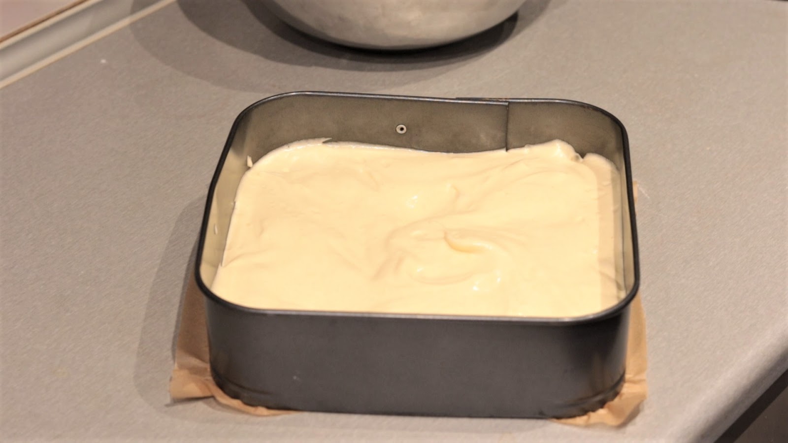4. Przelej biszkopt do blaszki wyłożonej papierem i piecz ok. 15 min w 180 st C (góra-dół z termoobiegiem). Po wystudzeniu przekrój biszkopt na dwa blaty;
