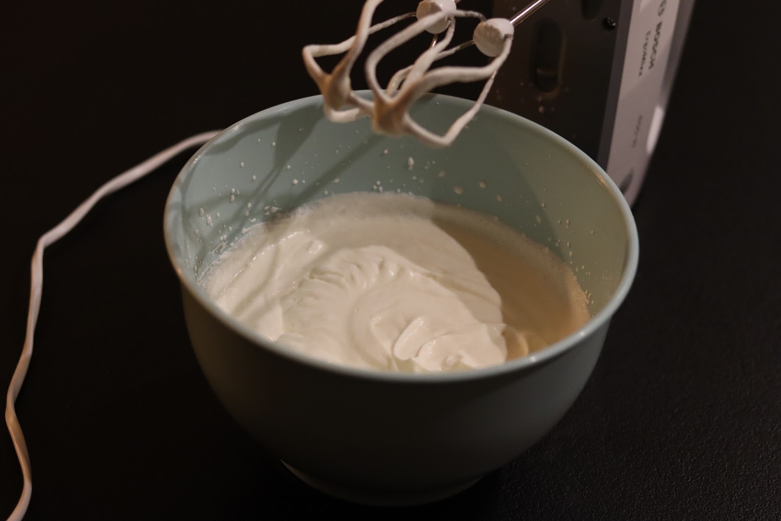11. Resztę śmietanki zmiksuj (nie musi być ubita na sztywno) a następnie dodawaj powoli do białej masy czekoladowej. Całość dokładnie wymieszaj;
