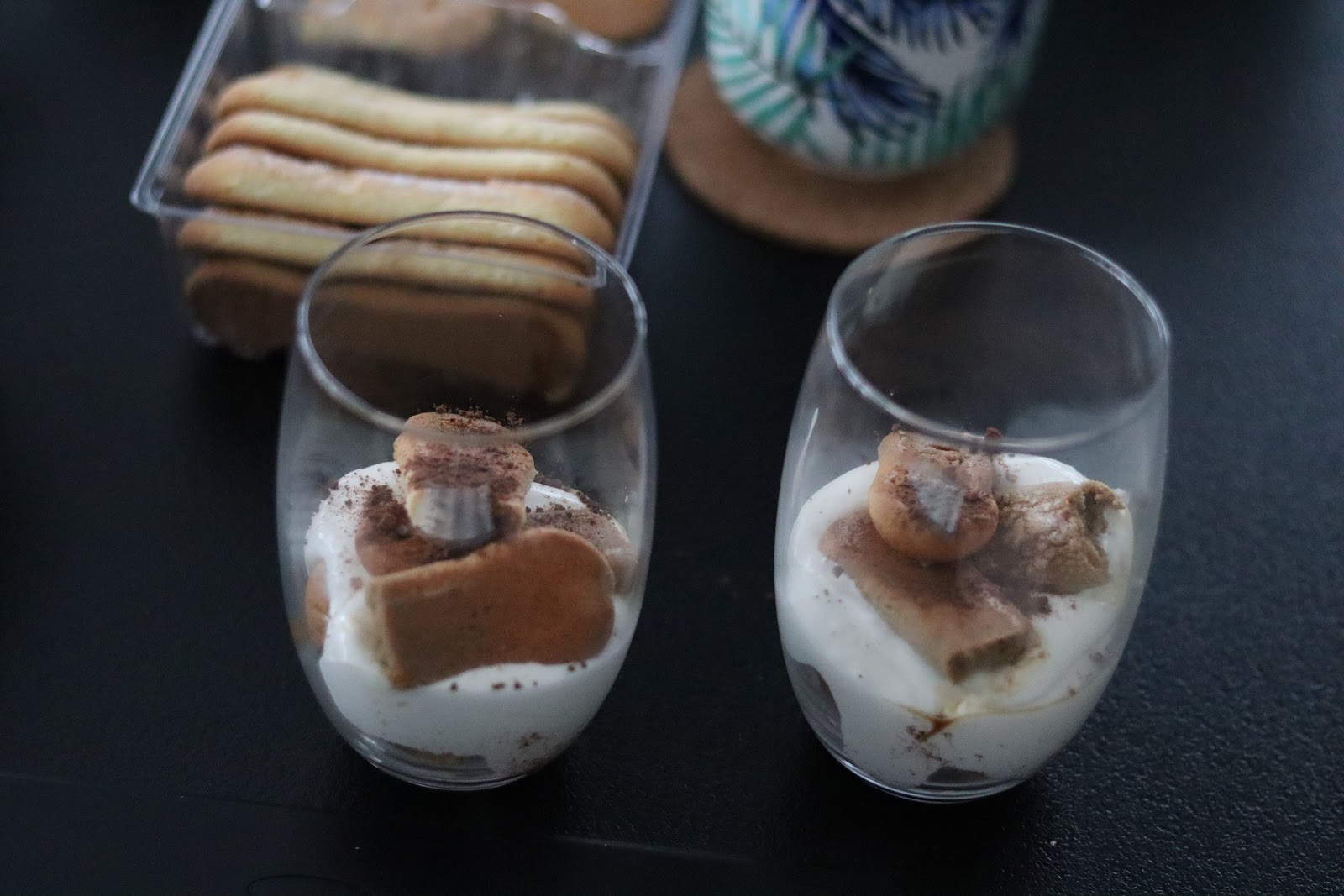 4. Na dnie pucharków ułóż po 2-3 kawałki herbatników nasączonych kawą, posyp je odrobiną kakao i wyłóż pierwszą warstwę kremu śmietankowego;